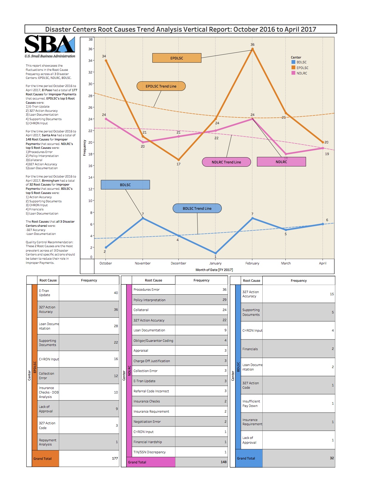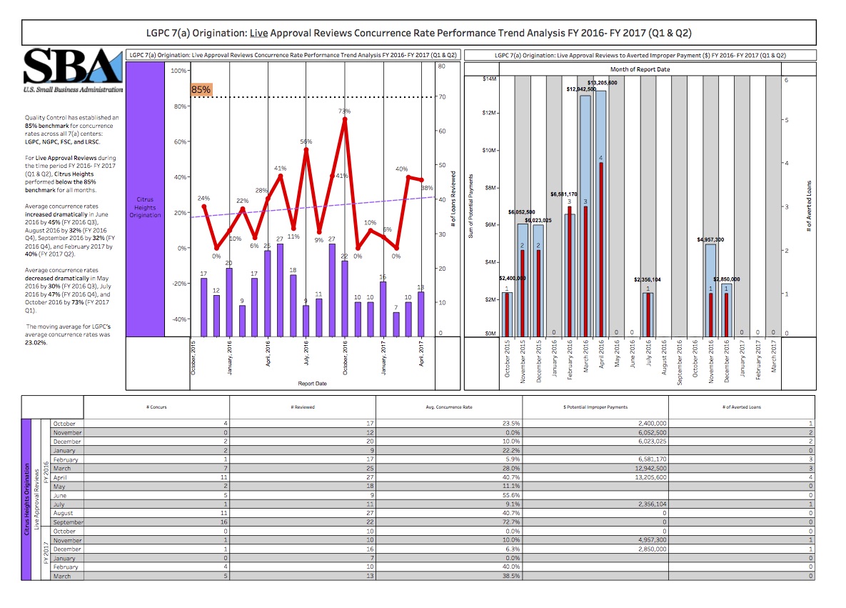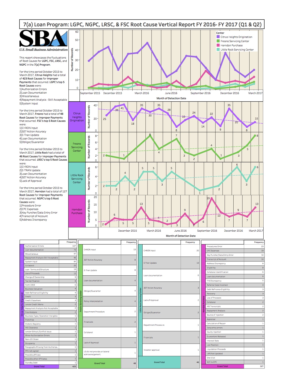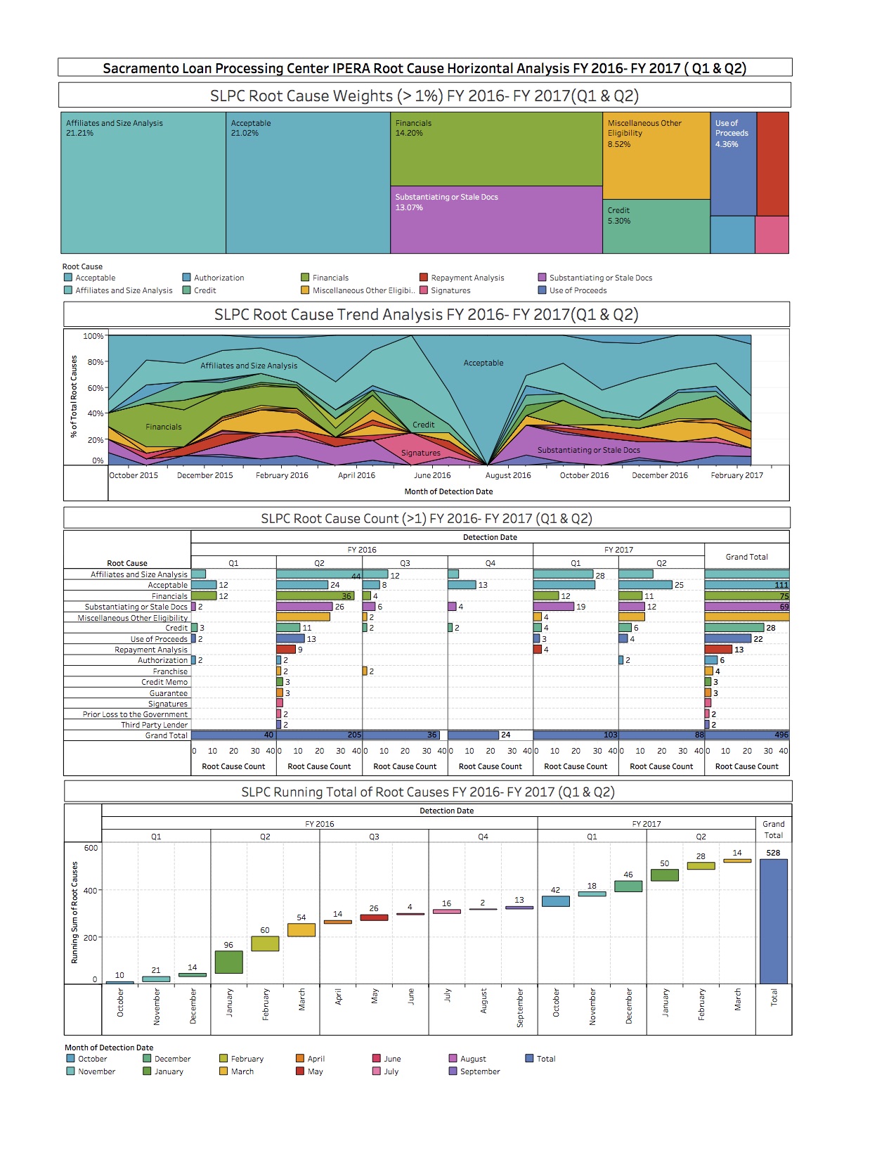 As a Business Analyst for the SBA’s headquarters in Washington D.C., I was responsible for contributing to the integrity of loans and loan programs in the Quality Control Program within the Office of Financial Programs and Operations. I achieved this by focusing on analytics from SBA’s eight centers located throughout the U.S. These eight centers were tailored to different stages of the loan lifecycle and loan products. I extracted data from Sharepoint and used Excel and Tableau to perform vertical and horizontal analysis in order to assess the key performance indicators and perceived risks of all eight centers through dashboards. I also provided management with recommendations that maximized each center’s compliance with SBA’s risk management and internal control procedures. This internship gave me a good understanding of the dynamics of small business financing and the potential of data analytics to solve real world problems. Here are some of the deliverables for the 2nd quarter (Q2) of the Fiscal Year 2017 (FY2017) that I developed using Tableau: