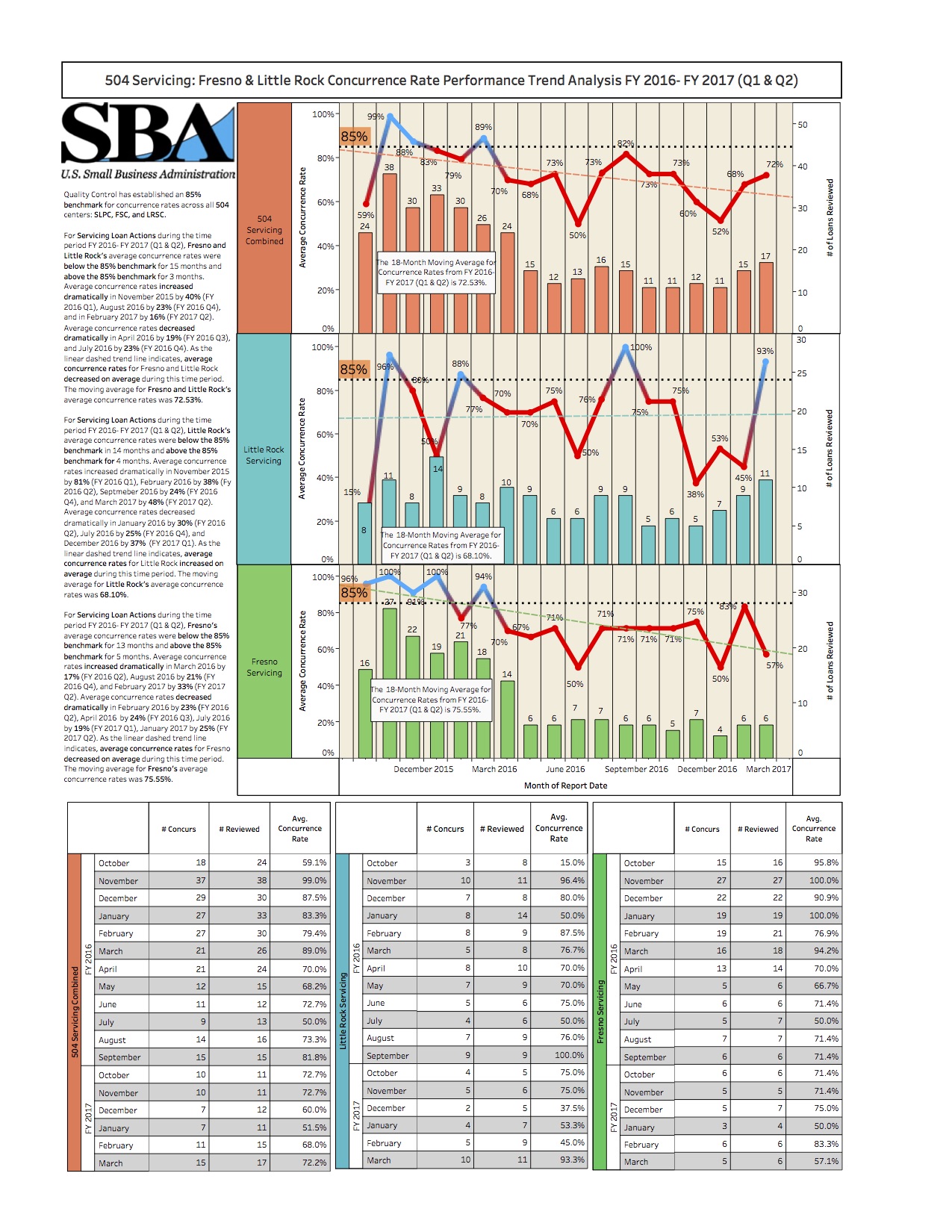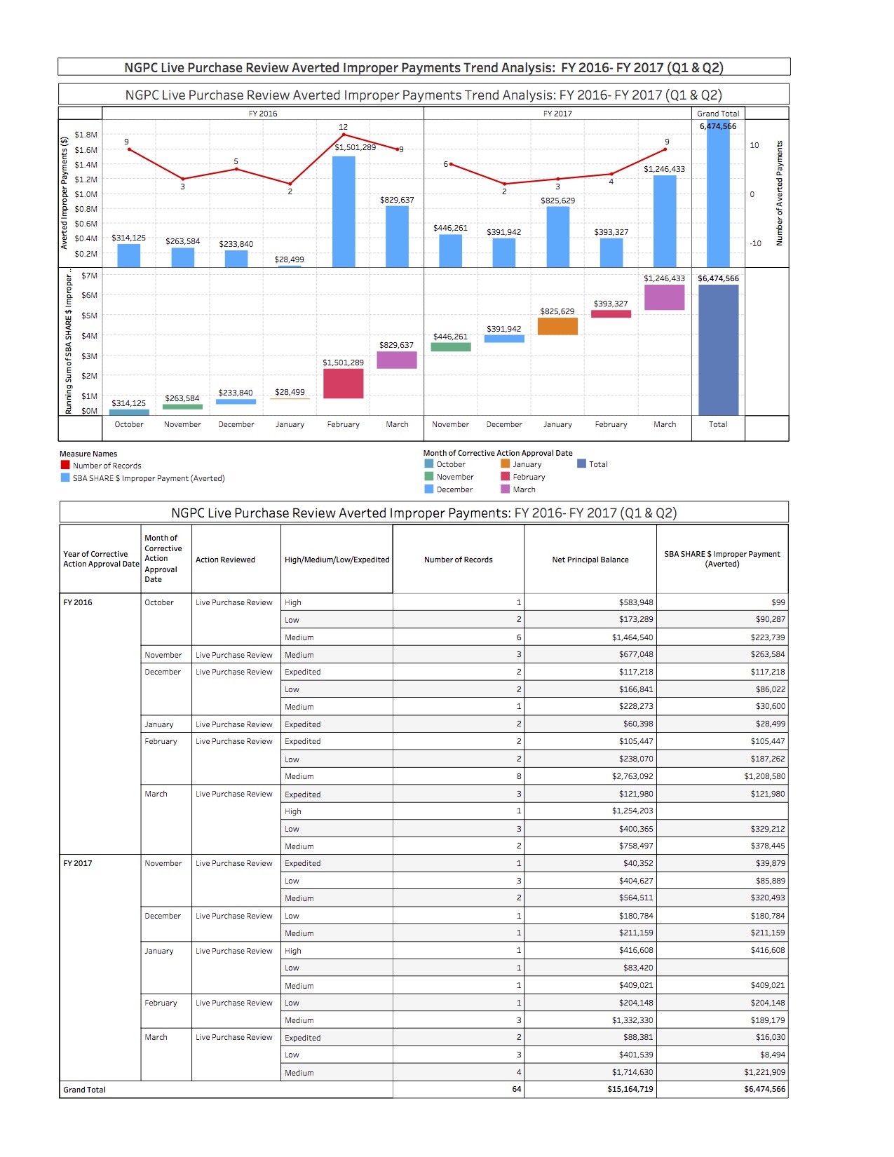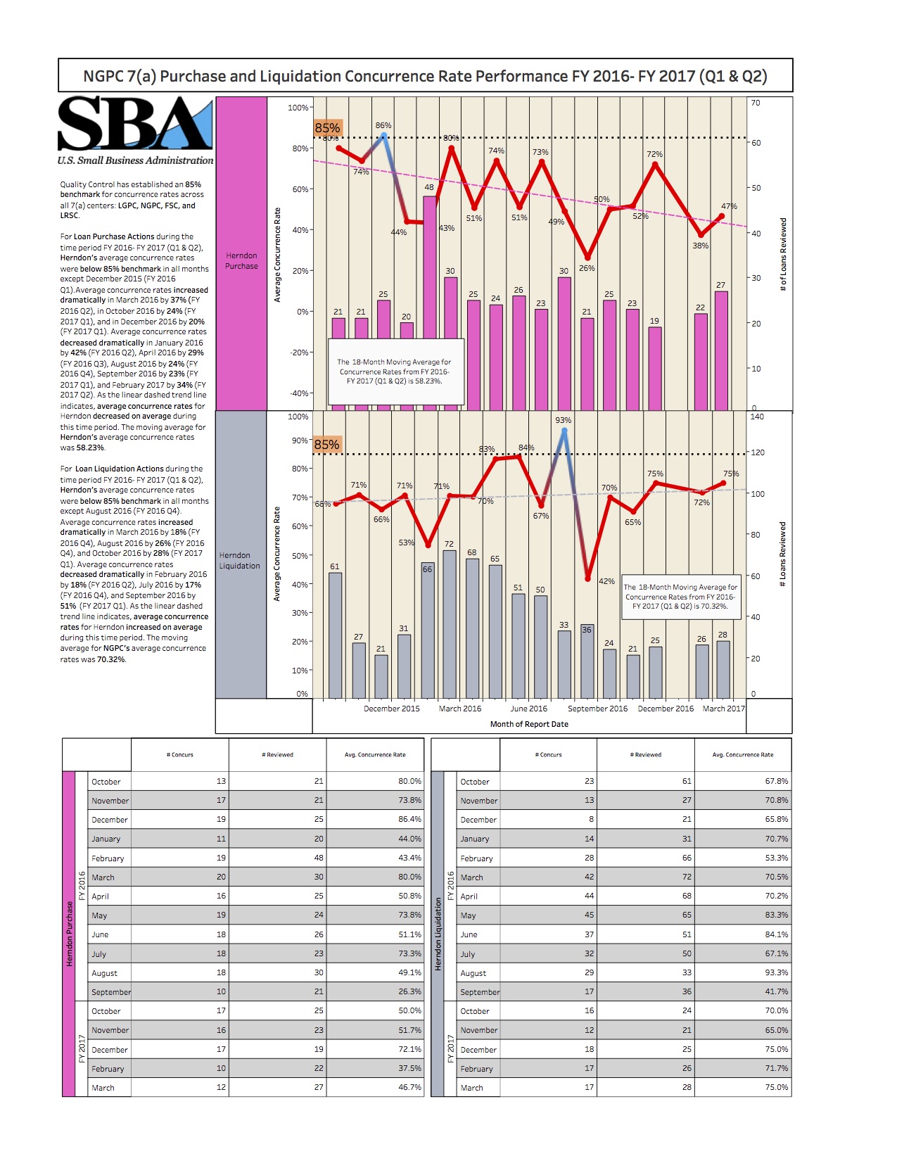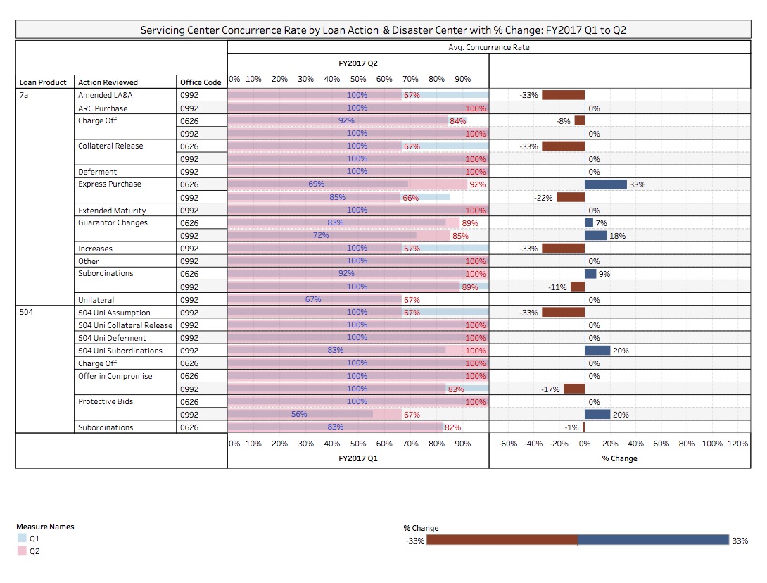 As a Business Analyst for the SBA’s headquarters in Washington D.C., I was responsible for contributing to the integrity of loans and loan programs in the Quality Control Program within the Office of Financial Programs and Operations. I achieved this by focusing on analytics from SBA’s eight centers located throughout the U.S. These eight centers were tailored to different stages of the loan lifecycle and loan products. I extracted data from Sharepoint and used Excel and Tableau to perform vertical and horizontal analysis in order to assess the key performance indicators and perceived risks of all eight centers through dashboards. I also provided management with recommendations that maximized each center’s compliance with SBA’s risk management and internal control procedures. This internship gave me a good understanding of the dynamics of small business financing and the potential of data analytics to solve real world problems. Here are some of the deliverables for the 2nd quarter (Q2) of the Fiscal Year 2017 (FY2017) that I developed using Tableau: