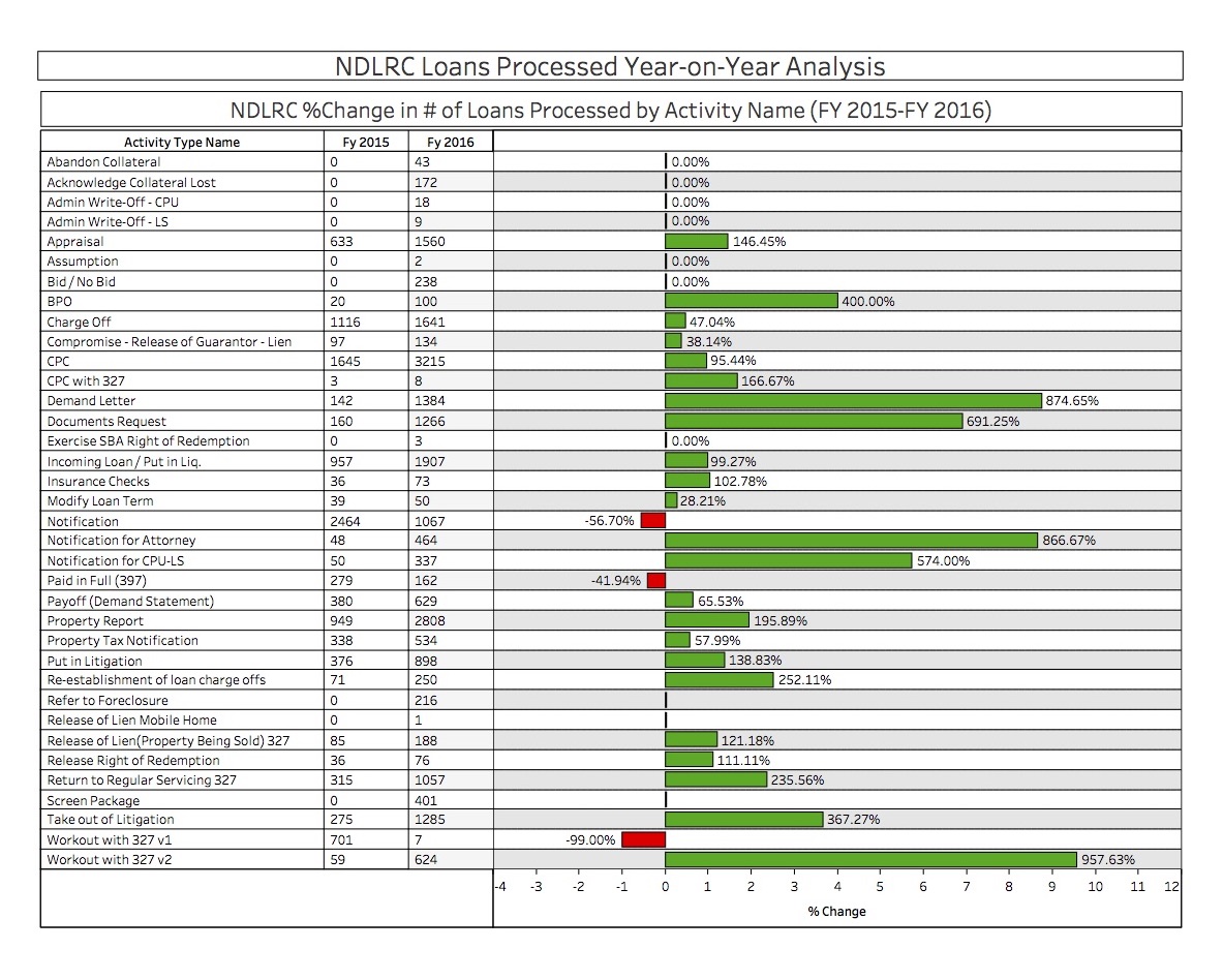 Here are some of the dashboards I created. Although these are nice and concise, the process to create these was anything but easy. I had to restructure, merge, and manipulate data in excel. Once the I cleaned the data, I made these dashboards using the Tableau software to perform outlier and trend analysis. These also proved helpful to get a general sense of how each loan program or loan center was doing.